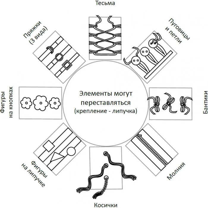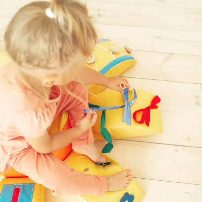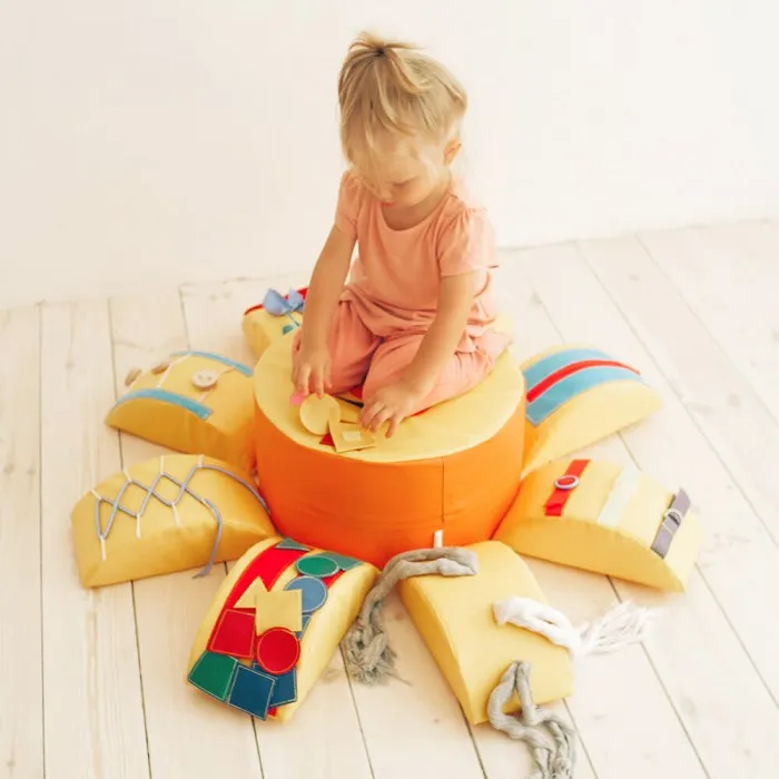 Это яркий пуф в виде солнца с восемью лучами, каждых из которых снабжен шнуровками, ремешками, ленточками, цветами на кнопках и тд. Для развития мелкой моторики. В комплекте: пуфик, лучики. Габаритные размеры: 800 х 800 мм