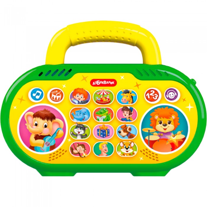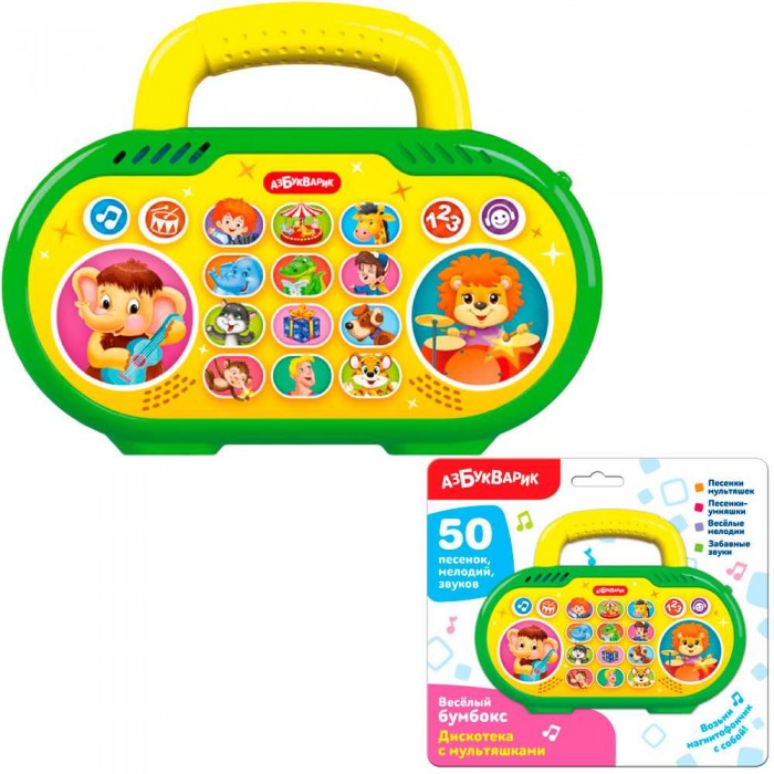 Размер упаковки: 21,1 х 19,2 х 2,7 см Размер изделия: 16 х 12,2 х 2,5 см Функционал: музыкальная игрушка Вид упаковки: блистер с картоном Страна-изготовитель: Китай Материал: полимеры Комплектация: игрушка - 1 шт Возраст ребенка: для детей от 3 лет Ультрамодная игрушка – Весёлый бумбокс! Особенности: - 50 песенок, мелодий и звуков - популярные песенки - обучающие песенки - забавные звуки - работает от 2-х батареек ААА