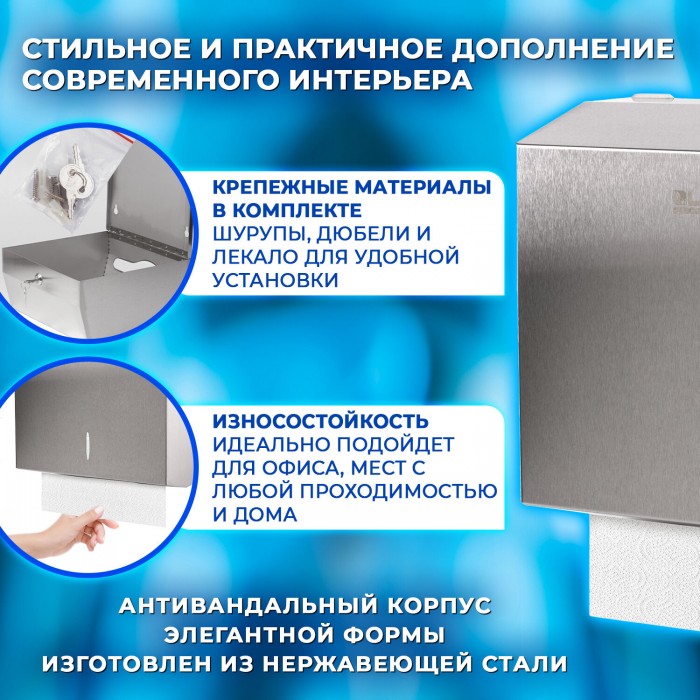 Диспенсер для бумажных полотенец LAIMA PROFESSIONAL подходит для использования в местах с любой проходимостью, таких как туалетная комната в ресторане, офисе, торговом центре, аэропорту и т. д. Отличается высокими эксплуатационными характеристиками.