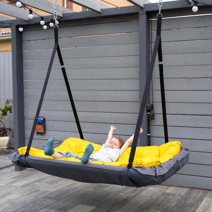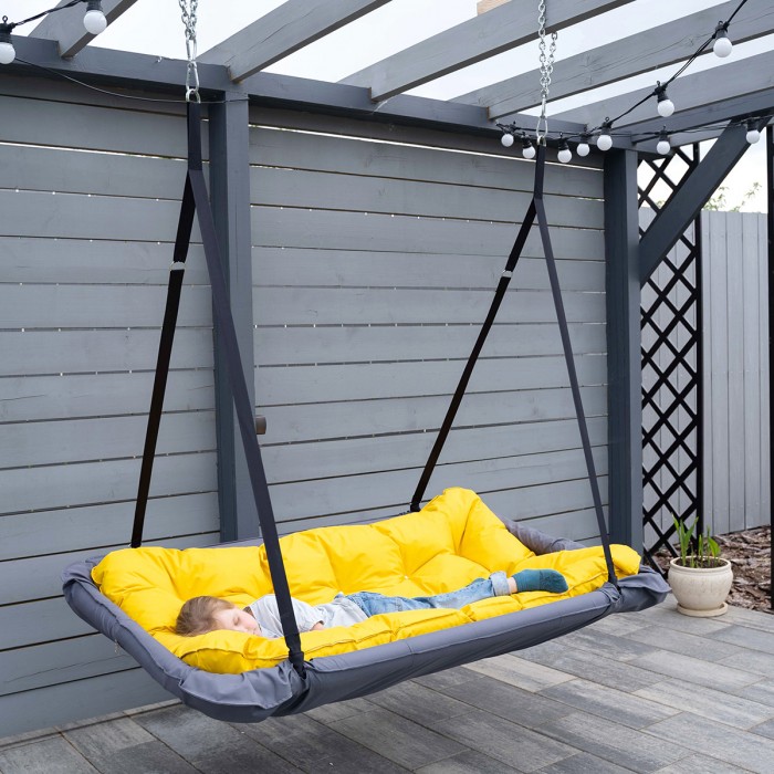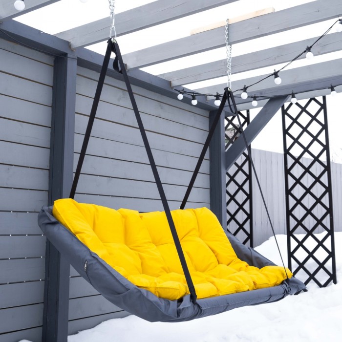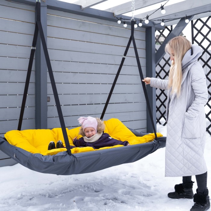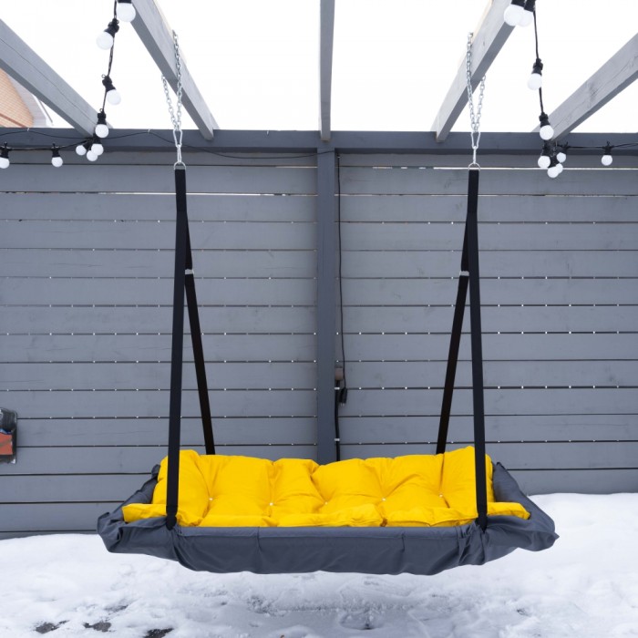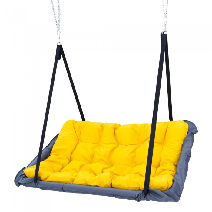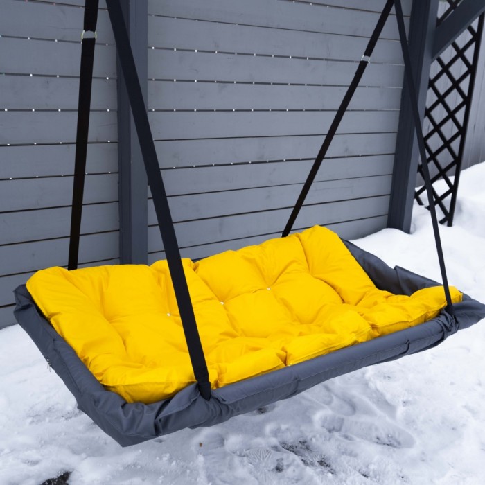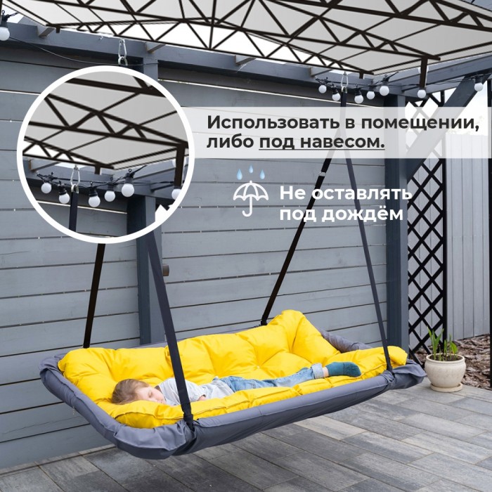 Подвесной диван прекрасно дополнит зону отдыха и станет любимым местом спокойного досуга детей и взрослых. Диван имеет подвесную конструкцию, состоящую из прочного металлического каркаса с чехлом и съемного мягкого матраса. Тканевый чехол и подушка выполнены из качественного оксфорда контрастных цветов.