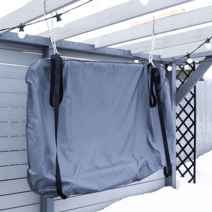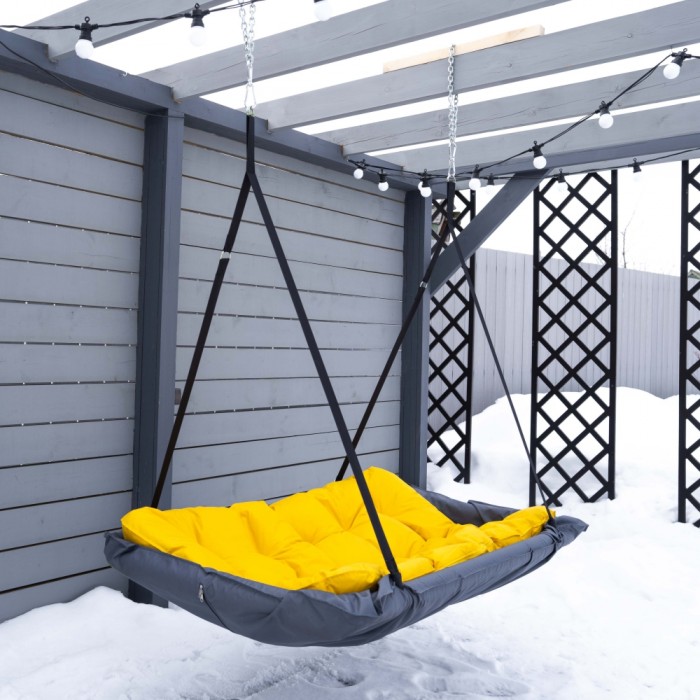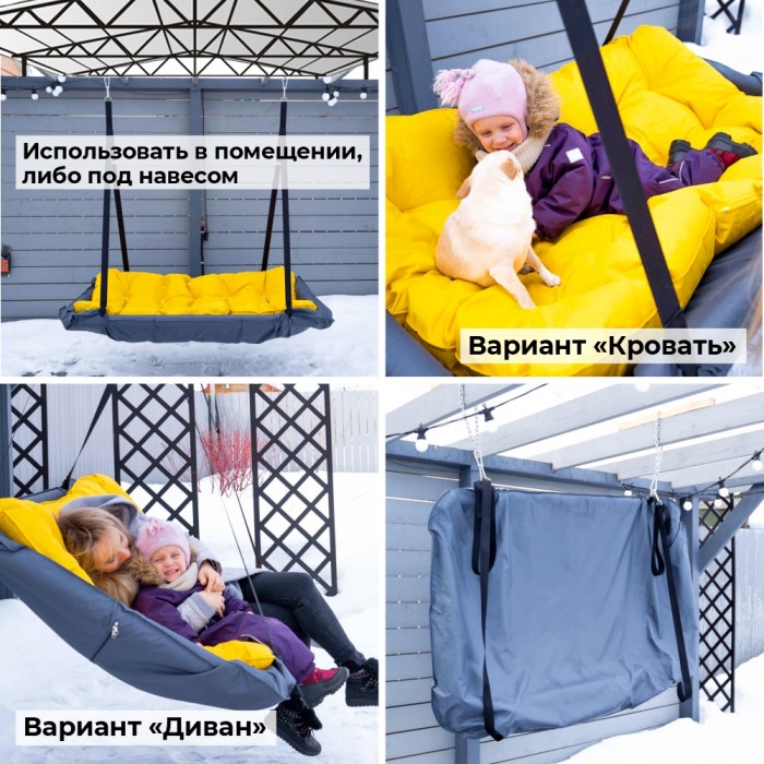 В подвесе диван фиксируется туристической лентой повышенной прочности. Изделие имеет три вида раскладки: кровать, диван и антидождь. Раскладка изменяется путем регулирования наклона корпуса дивана.
