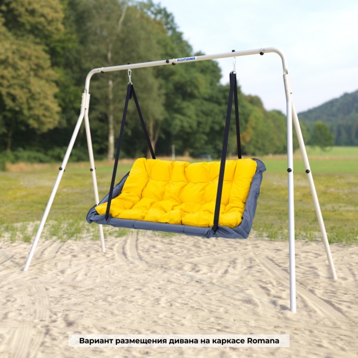 Изделие можно установить на каркас дачных комплексов ROMANA: Акробат-2, Богатырь плюс-2 и Каркас для качелей. Также диван можно закрепить к потолку. В комплект входят 2 типа крепежей: анкеры для крепления к потолку и карабины для монтажа к спортивному комплексу. Дополняет набор прочная цепь толщиной 6мм, с помощью которой можно регулировать высоту дивана при креплении к потолку.Состав: