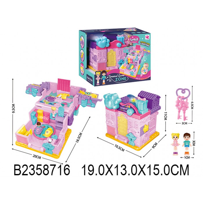 Размер упаковки: 19 х 13 х 15 см Размер изделия: домик сложенный 10,5 х 9 х 11 см, разложенный 20 х 18,5 х 9,5 см, кукла 1 х 3 см, ключ 6,5 3 см Функционал: кукольный домик, складной, с подсветкой Упаковка: картонная коробка блистерного типа Страна производитель: КНР Материал: пластик Комплектация: дом - 1 шт., кукла - 2 шт., ключ - 2 шт. Возраст ребенка: от 3 лет Кукольный дом с набором мебели станет чудесным подарком для девочки. Особенности: - складная конструкция; - имеется подсветка; - работает от батареек; - яркая расцветка; - безопасные материалы; - куклы и мебель в комплекте. С таким красочным набором девочка сможет придумать и разыграть множество увлекательных сюжетов. Поселить в домике можно куклу из набора или любые подходящие по размеру игрушки. Игры с куклами: - благотворно воздействуют на психоэмоциональное развитие; - развивают воображение; - помогают реализовывать различные модели поведения; - позволяют проигрывать жизненные ситуации.