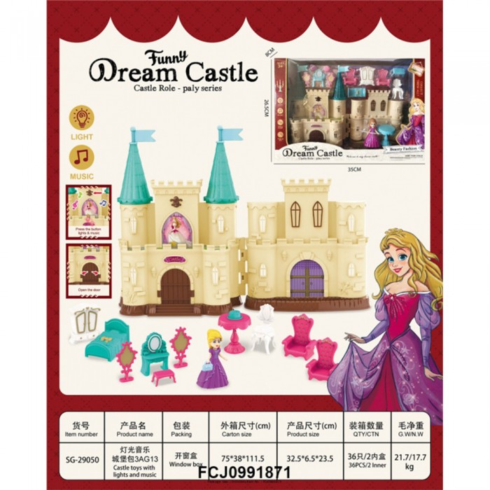 Размер упаковки: 35 х 8 х 26,5 см Размер изделия: 32 х 4 х 26 см Функционал: аксессуары для кукол, кукольный домик Вид упаковки: картонная коробка блистерного типа Страна производитель: КНР Материал: пластик Комплектация: кукольный дом - 1 шт, мебель для дома - 10 шт, кукла - 1 шт Возраст ребенка: для детей от 3 лет Большой яркий дом с набором мебели станет чудесным подарком для девочки. Особенности: - игровые аксессуары в комплекте - качественные материалы - дом в форме сказочного замка - световые и звуковые эффекты - необходимы 3 батареи AG 13 (в комплекте) В наборе: - комплект из 2-х кресел - комплект из 2-х стульев - стол - туалетный столик с пуфиком - шкаф - игровые аксессуары 3 шт - кровать - кукла принцесса