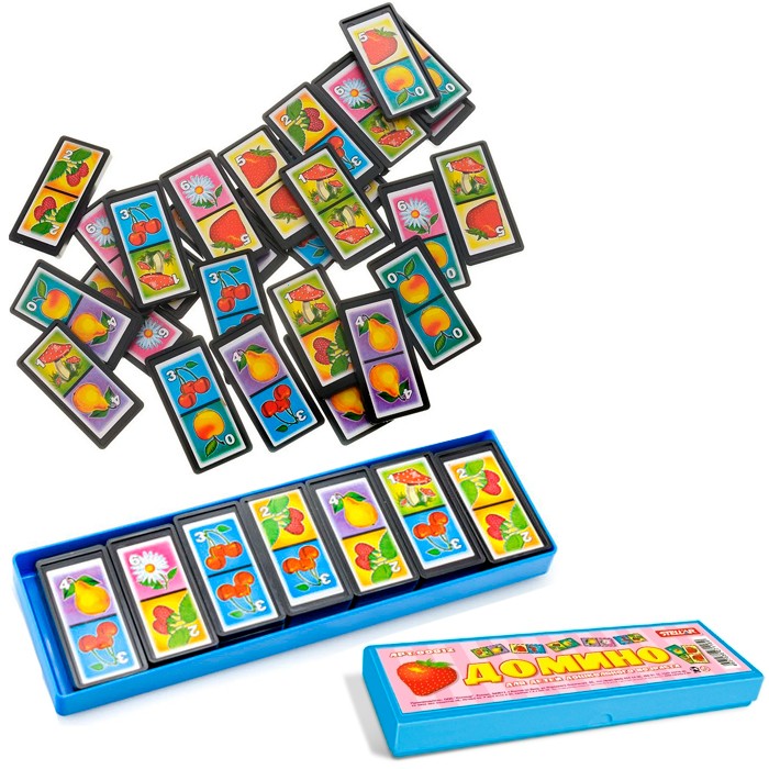 Комплектация: домино - 28 шт. Материал: пластик, бумага Упаковка: футляр пластмассовый Размер упаковки: 5,5*18*2 см, вес - 110 г Возраст: 3+ Страна обладатель бренда: Россия Домино - это веселая настольная игра для дружной компании. Игра состоит из пластмассовых карточек. На лицевую сторону нанесено изображение фруктов, ягод и грибов и цифры. Играя в домино, ребенок сможет получить представление о внешнем виде различных фруктов, познакомится с цифрами, будет тренировать логику и мышление. Изображения красочно и качественно напечатаны. Каждый игрок должен добавить в цепочку из фишек одну их своих фишек так, чтобы изображение на ней подошло к изображению на конце цепи. Если в руках у игрока нет подходящей фишки, он берет дополнительные до тех пор, пока не попадется нужная. Выигрывает тот, кто первым выложит все свои фишки.
