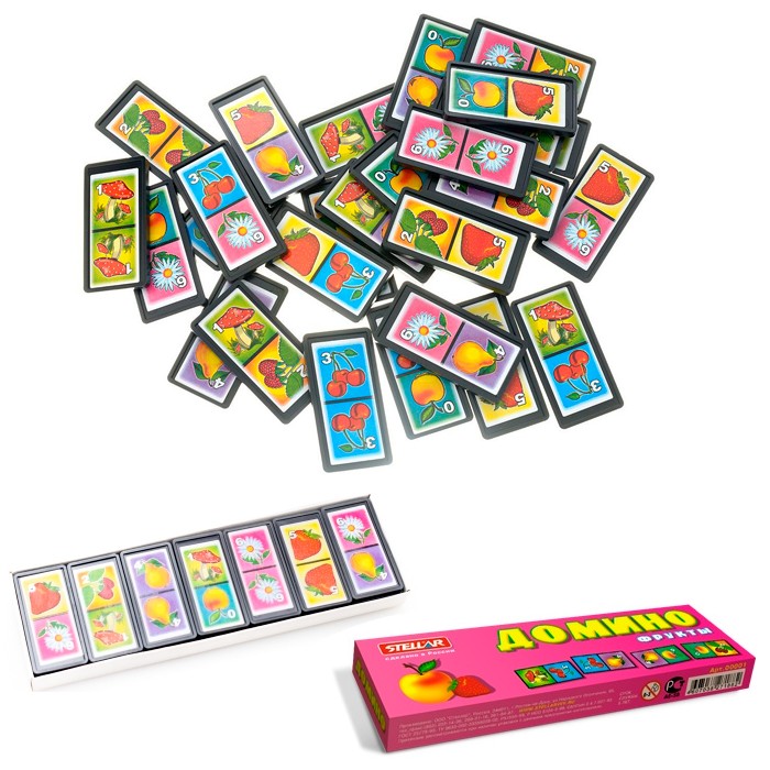 Комплектация: домино - 28 шт. Материал: пластик, бумага Упаковка: картонная коробка Размер упаковки: 18,5*2*5,5см, вес - 85 г Размер фишки: 5*2,5 см Возраст: 3+ Страна обладатель бренда: Россия Домино - это веселая настольная игра для дружной компании. Игра состоит из пластмассовых карточек. На лицевую сторону нанесено изображение фруктов, ягод и грибов и цифры. Играя в домино, ребенок сможет получить представление о внешнем виде различных фруктов, познакомится с цифрами, будет тренировать логику и мышление. Изображения красочно и качественно напечатаны. Каждый игрок должен добавить в цепочку из фишек одну их своих фишек так, чтобы изображение на ней подошло к изображению на конце цепи. Если в руках у игрока нет подходящей фишки, он берет дополнительные до тех пор, пока не попадется нужная. Выигрывает тот, кто первым выложит все свои фишки.