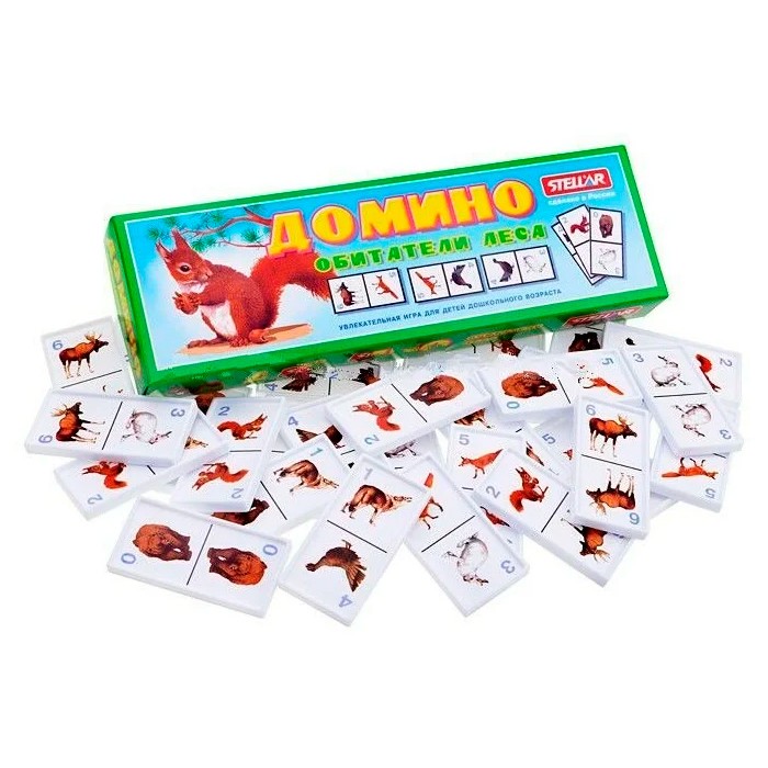 Комплектация: домино - 28 шт. Материал: пластик, бумага Упаковка: картонная коробка Размер упаковки: 3,5*8*25 см, вес - 220 г Возраст: 3+ Страна обладатель бренда: Россия Домино - это веселая настольная игра для дружной компании. Игра состоит из пластмассовых карточек. На лицевую сторону нанесено изображение лесных животных и цифры. Играя в домино, ребенок сможет получить представление о внешнем виде различных зверей, познакомится с цифрами, будет тренировать логику и мышление. Изображения красочно и качественно напечатаны. Каждый игрок должен добавить в цепочку из фишек одну их своих фишек так, чтобы изображение на ней подошло к изображению на конце цепи. Если в руках у игрока нет подходящей фишки, он берет дополнительные до тех пор, пока не попадется нужная. Выигрывает тот, кто первым выложит все свои фишки.