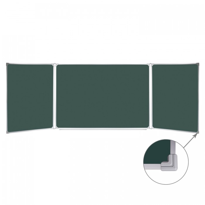 Трехэлементная настенная комбинированная магнитная доска с антибликовым покрытием. Имеет 5 рабочих поверхностей: 3 для работы мелом и 2 для работы маркером.