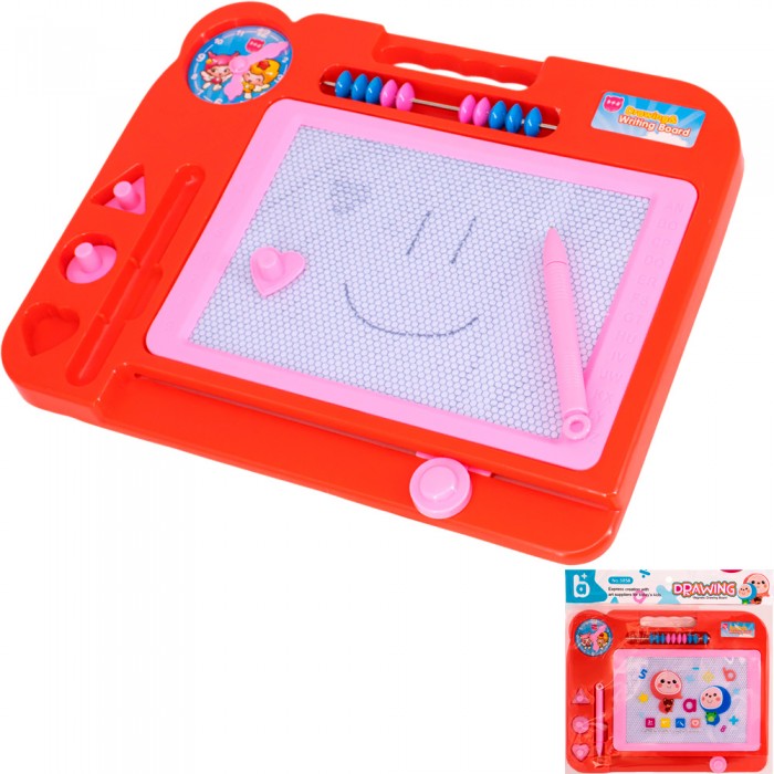 Размер упаковки: 27*2*22 см Вес: 224 г Функционал: доска для рисования Упаковка: пакет с хедером Страна обладатель бренда: КНР Материал: пластик Комплектация: доска - 1 шт., стек -1 шт., штампик - 3 шт. Возраст ребенка: от 3 лет • Доска для рисования позволит ребенку создать множество интересных графических работ, а также сэкономит бумагу. • Это оригинальное устройство работает благодаря наличию магнита, встроенного в специальный карандаш. • Ручка выстраивает металлическое содержимое доски в ту форму, которая необходима ребенку. • Кроме того, фигурные печати помогут сделать рисунки еще более интересными. • На доске расположены цветные счёты и циферблат со стрелками для изучения времени. • Такой набор - замечательный подарок и развивающее пособие для малыша.