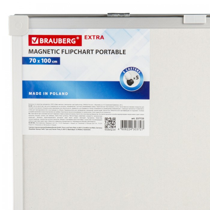 Доска-флипчарт магнитно-маркерная 70х100 см, передвижная, на роликах, Польша, BRAUBERG Extra, 237725