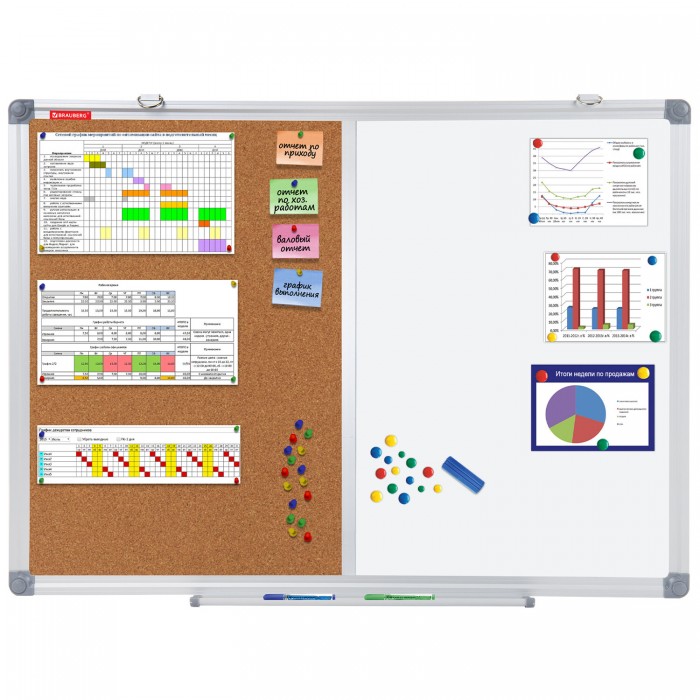 Комбинированная доска BRAUBERG Extra: магнитно-маркерная и пробковая доски в единой рамке для экономии пространства. Идеально подходит для использования в любых организациях.