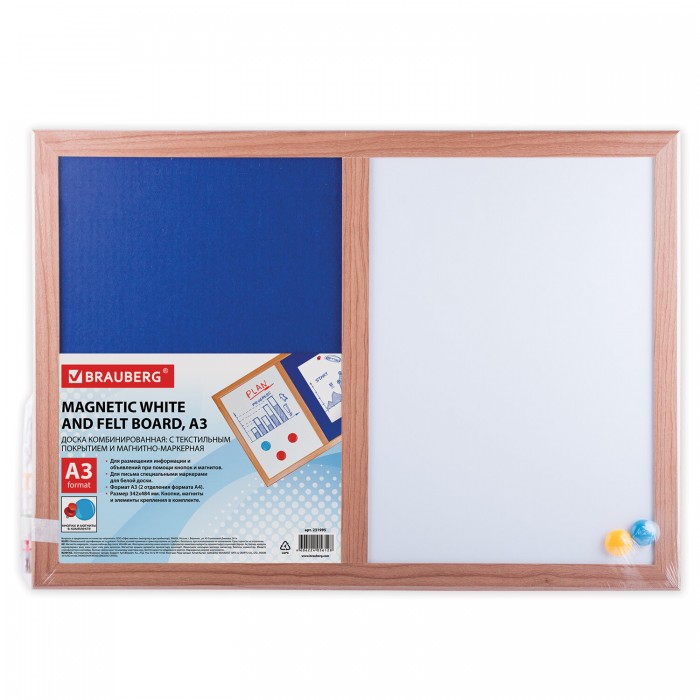Комбинированная доска BRAUBERG - магнитно-маркерная и пробковая доски в единой рамке - позволит разместить объявления при помощи кнопок и офисных булавок. Широко используется в организациях различного рода деятельности.