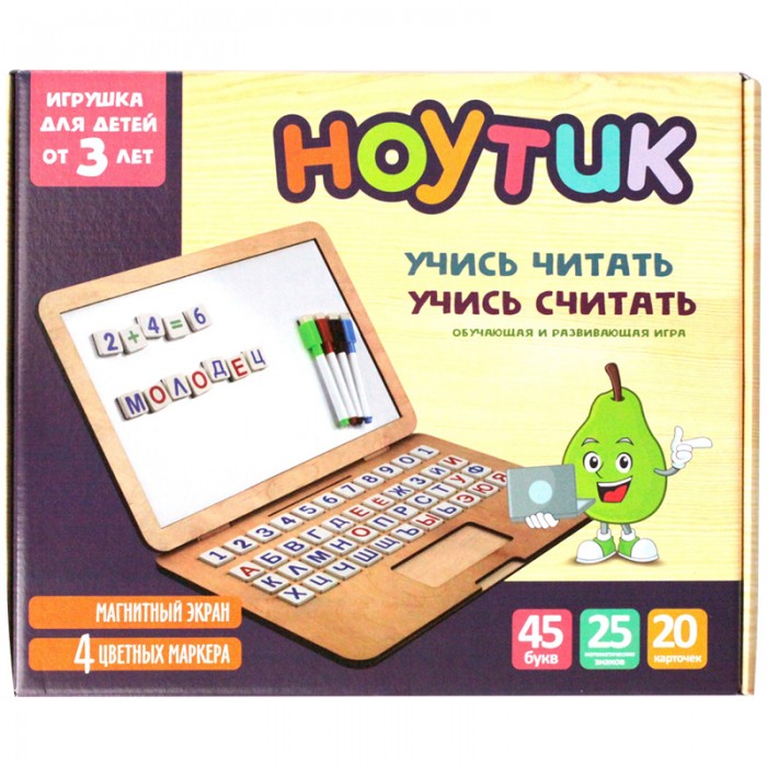 Детский компьютер «Ноутик» – это развивающая игрушка из дерева, которая в игровой форме поможет впервые познакомить ребёнка с буквами русского алфавита и цифрами. Состав игры: деревянный ноутбук (размер в сложенном виде – 24х35 см, высота в раскрытом виде – до 49 см, толщина фанеры – 5 мм), деревянные фишки-клавиши на магнитной основе – 70 шт. (размер – 1,9х1,9, толщина – 4 мм), картонные карточки – 20 шт. (10х4 см), цветные маркеры – 4 шт. Материал: берёзовая фанера, картон, магнит. Развивает у ребёнка навыки счёта, помогает изучить алфавит, развивает творческие способности. Магнитно-маркерный экран легко отсоединяется от основы.