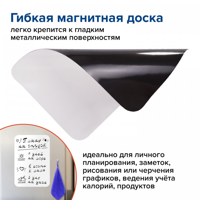 Магнитно-маркерная доска BRAUBERG на холодильник предназначена для письма маркерами для белых досок и меловыми маркерами. Это гибкая магнитная доска, которая легко крепится к гладким металлическим поверхностям и не требует дополнительной фиксации.