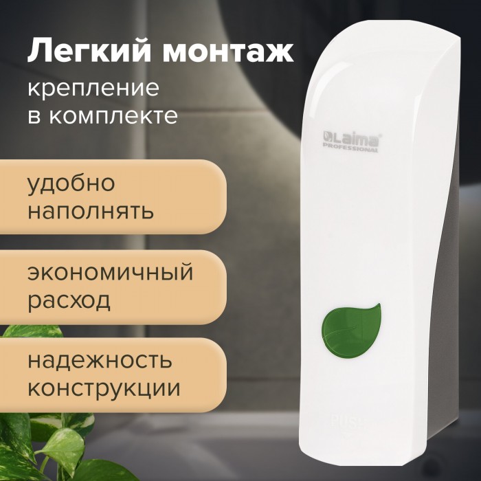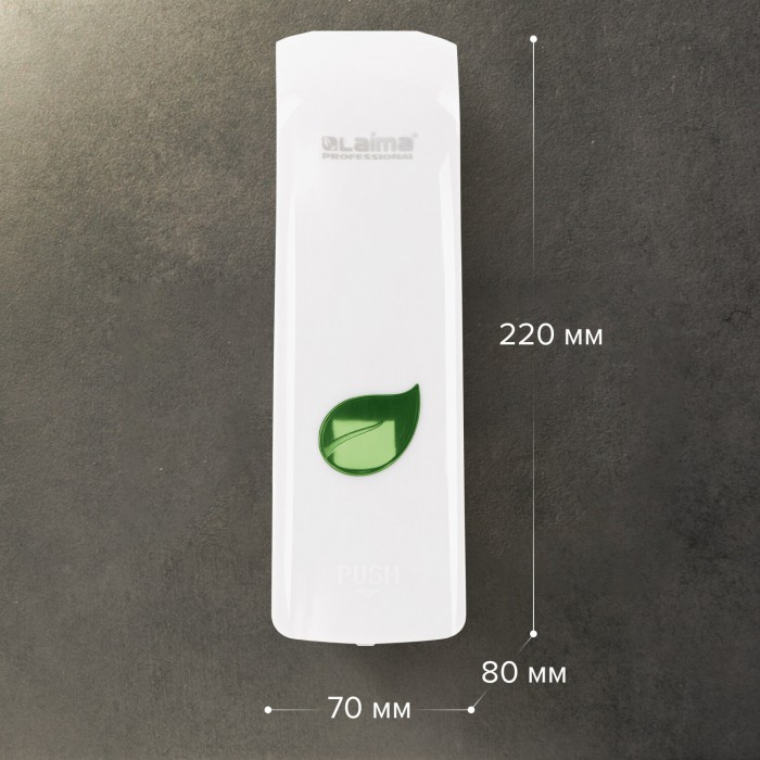 Дозатор для жидкого мыла LAIMA PROFESSIONAL ECO подходит для использования в местах с любой проходимостью, таких как туалетная комната в ресторане, офисе, торговом центре. Отличается компактными размерами и оригинальным дизайном.
