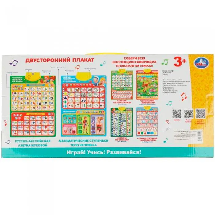 Размер упаковки: 44 x 22 x 3 см Размер изделия: 57 x 40 x 2 см Функционал: интерактивная игрушка Вид упаковки: картонная коробка Страна-изготовитель: Россия Материал: пластик, металл Комплектация: планшет - 1 шт Возраст ребенка: для детей от 3 лет Обучающий двусторонний плакат 4 в 1 «М.А. Жукова. Азбука», «Тело человека», «Английский алфавит» и «Весёлая математика» ТМ «Умка» - многофункциональный помощник малышу в познании окружающего мира. Особенности: - 2 песни (фрагменты): «АБВГДейка» и «Улыбка» - 500+ песен и звуков - 150+ стихов, вопросов и загадок - произносим звуки и учим буквы правильно - кнопка «Вкл./Выкл.» - регулировка громкости - соответствует ФГОС - работает от 3-х батареек типа ААА (не входят в комплект)