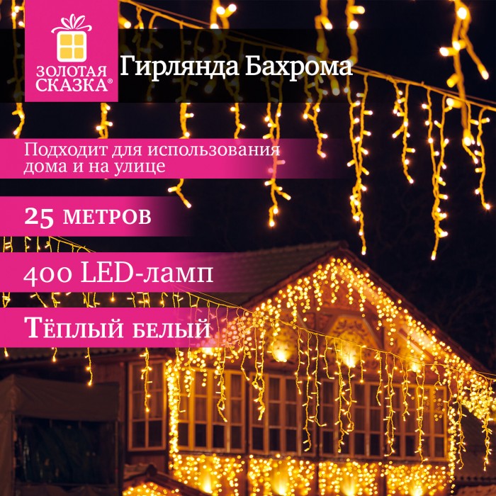 Электрогирлянда-бахрома уличная 25х0,7м, 400LED, тёплый белый, 220V, контроллер, ЗОЛОТАЯ СКАЗКА, 592551
