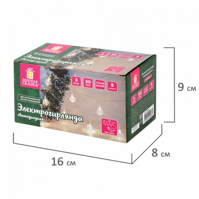 Яркая и красочная электрогирлянда ЗОЛОТАЯ СКАЗКА – ей которой можно украсить как новогоднюю ель, так и интерьер любого помещения. Лампы украшены разноцветными декоративными колпачками в виде шариков.