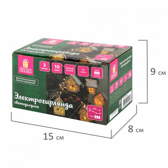 Электрогирлянда-нить комнатная "Домики дерево", 2 м, 10 LED, теплый белый, на батарейках, ЗОЛОТАЯ СКАЗКА, 591728