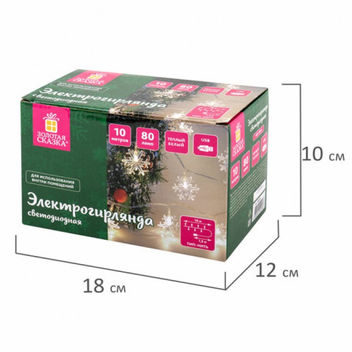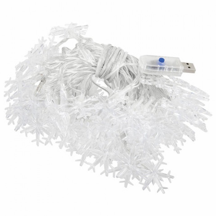Электрогирлянда-нить комнатная "Снежинки" 10 м, 80 LED, теплый белый, USB, ЗОЛОТАЯ СКАЗКА, 592204