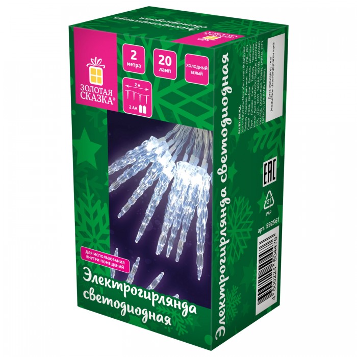 В интернет-магазине AV Group можно купить Электрогирлянда-нить комнатная "Сосульки" 2м, 20LED, холодный белый, батарейки, ЗОЛОТАЯ СКАЗКА, 592561, производитель Китай, артикул 592561 по цене 274 руб. Продаем физическим и юридическим лицам, при условии минимальной суммы заказа (общей суммы в корзине) от 5 тысяч рублей. Возможна доставка курьером по Верхней Пышме, Екатеринбургу и Свердловской области. В регионы отправляем транспортной компанией. Чтобы уточнить необходимое количество товара и дополнительные условия, звоните: 8(800)201-75-47, менеджер вас проконсультирует.