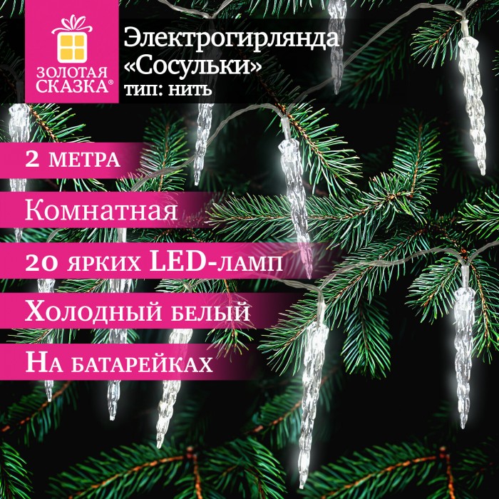 Электрогирлянда-нить комнатная "Сосульки" 2м, 20LED, холодный белый, батарейки, ЗОЛОТАЯ СКАЗКА, 592561