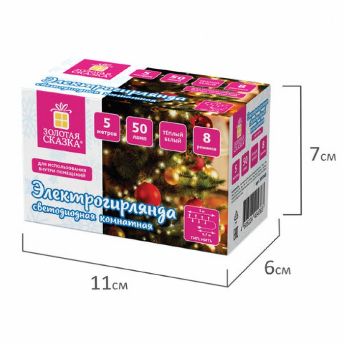 Электрогирлянда-нить комнатная "Стандарт" 5 м, 50 LED, теплый белый свет, 220 V, контроллер, ЗОЛОТАЯ СКАЗКА, 591343