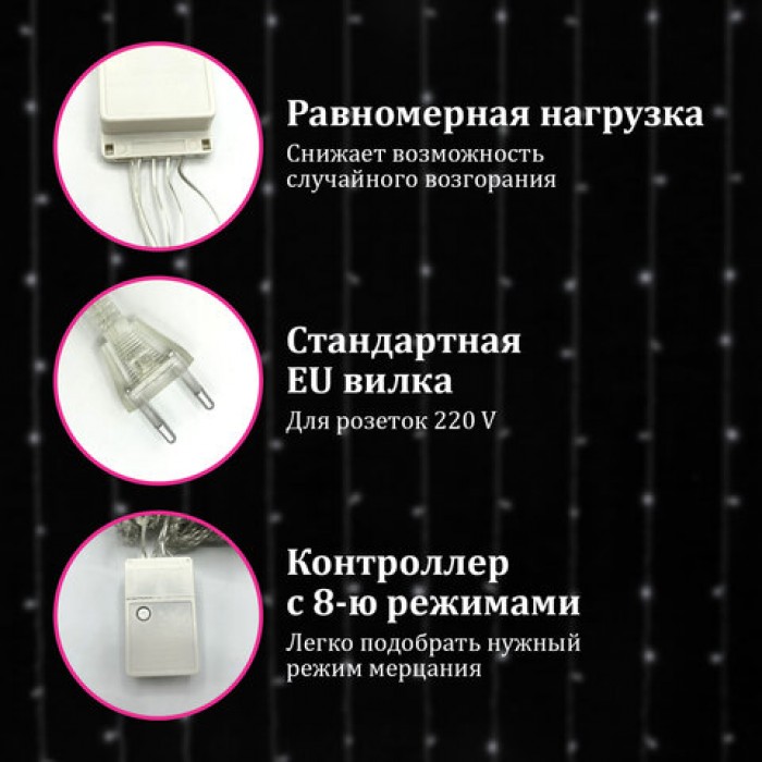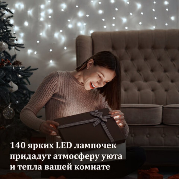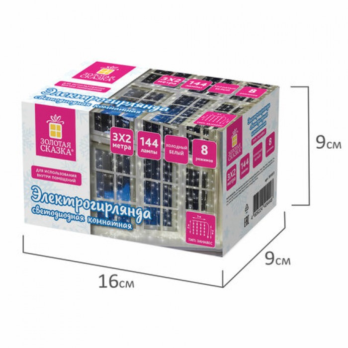 Электрогирлянда-занавес комнатная "Штора" 3х2 м, 144 LED, холодный белый свет, 220 V, ЗОЛОТАЯ СКАЗКА, 591351