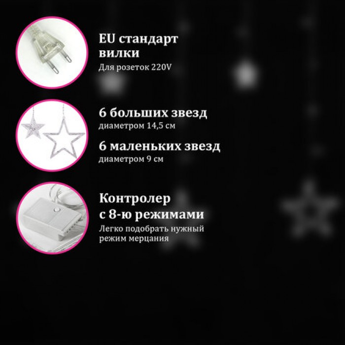 Электрогирлянда-занавес типа "Звезды" - необычный и эффектный вид гирлянд. Мягкий и вместе с тем насыщенный свет этих украшений позволяет использовать их для создания уютного свечения внутри помещений.