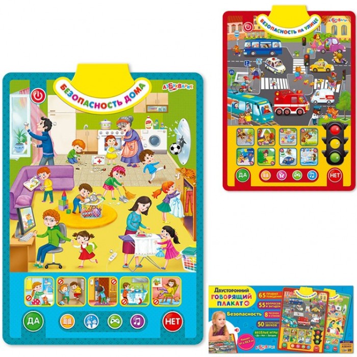 Правила безопасности важно знать всем детям. С этим двусторонним плакатом дети смогут изучить их в легкой игровой форме, нажимая на яркие говорящие картинки. Первая сторона – «Безопасность на улице», вторая – «Безопасность дома». Рассматривай забавные ситуации, изучай правила дорожного движения, слушай песенки, стихи и полезные советы от Саши и Даши. 65 правил поведения, 55 вопросов и загадок, 50 интересных звуков, 8 песенок и стихов – всё это поможет детям провести время и весело, и с пользой! Плакат можно повесить на стену любой стороной или играть с ним, где удобно. Подарок от Азбукварика – интерактивная азбука! Отсканируй QR-код на коробке и скачай её бесплатно. Техническое описание: Технические параметры: Электронная музыкальная игрушка Батарейки: 3ААА Вид упаковки: Картонная коробка Количество в упаковке: 1 Размер упаковки: 45,5х21х3,9 см Размер товара: 41х55,5 см