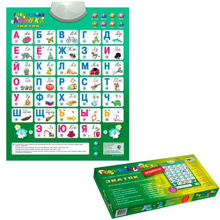 Размер упаковки- 50*23*4 см ТМ Знаток предлагает вашему вниманию новинку, которая появились в серии "Знаток". Это говорящая азбука с новыми функциями. В новом варианте учтены пожелания педагогов и родителей. "Говорящая азбука" 7 игровых режимов. В говорящей азбуке из серии звуковых плакатов "ЗНАТОК " с новыми функциями учтены пожелания педагогов и родителей. Играя с этим плакатом, каждый малыш выучит буквы и звуки, научится составлять слоги и слова, выучит весёлые стихи, научится читать и считать от 1 до 33. Плакат имеет семь режимов работы: Изучение названий букв. Знакомство со звуками. Звучит весёлая песенка про алфавит. Звучит стихотворение о предмете, указанном на соответствующей картинке под буквой. Произносятся названия цифр рядом с буквами. Ищем предмет или отгадываем загадку про предмет, название которого начинается на определённую букву. Экзамен. Ищем нужную букву на плакате.