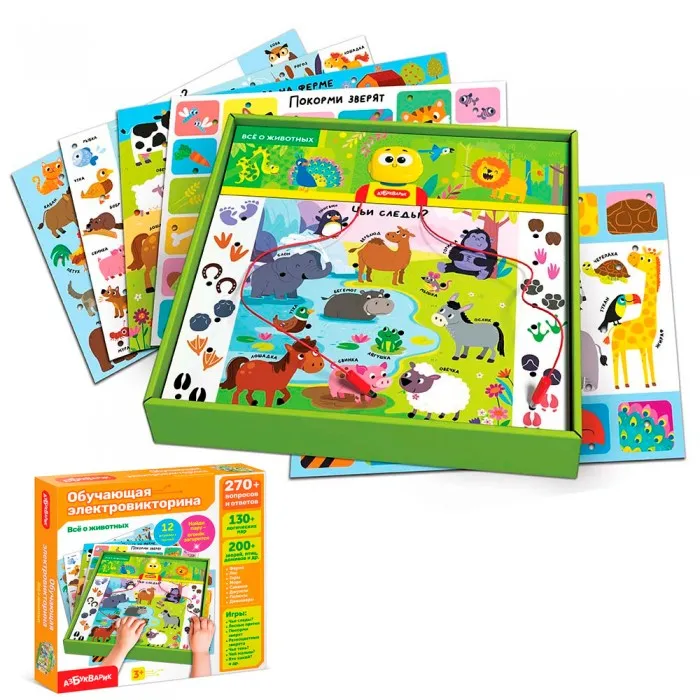 Размер упаковки: 31,7*31,3*4,6 см Размер изделия: 29*21 см Функционал: настольная игра, викторина, электротехническая игрушка со световым эффектом, 270 вопросов и ответов, 130+ логических пар, 200+ зверей, птиц, домиков и др., игры Упаковка: картонная коробка Страна обладатель бренда: Россия Материал: картон, пластик Комплектация: игровое поле - 6 шт. ( двусторонние карточки), плата, электронный модуль в виде робота и инструкция. Возраст ребенка: от 3 лет Настольная игра позволит весело и интересно провести совместный досуг с друзьями и в кругу семьи. Красочные элементы привлекут внимание ребенка. Викторина содержит сведения об окружающем мире. Ребенок изучит более 200 понятий (животные фермы, леса, саванны и других природных зон, динозавры, домики зверей и т.д.) и подберет более 130 логических пар. На каждой стороне карточки представлена оригинальная тематическая игра: «Чьи следы?», «Лесные прятки», «Покорми зверят», «Разноцветные зверята», «Чья тень?», «Чей малыш?», «Кто какой
