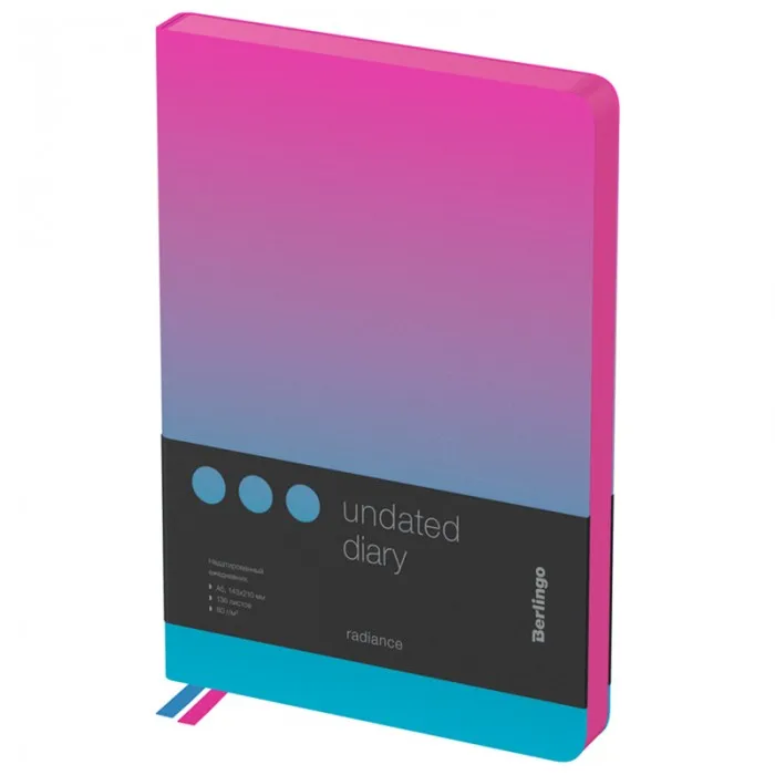 Стильный недатированный ежедневник Berlingo Radiance формата A5 с ярким цветным контрастным срезом и ультрамягкой обложкой из высококачественной экокожи. Насыщенный розово-голубой градиент стильно сочетается с розовым срезом. Внутренний блок состоит из 136 листов высококачественной кремовой бумаги повышенной плотности 80 г/м² с пантонной печатью в 2 краски. Недатированный ежедневник Berlingo Radiance представлен в размере 143 на 210 мм. Перфорированные уголки, справочная информация и 2 закладки-ляссе сделают использование ежедневника Berlingo Radiance комфортным. Внутри располагаются отрывные заметки, бланки извещения о ДТП и справочные материалы. Недатированный прошитый ежедневник Berlingo подходит под персонализацию. 3 комплекта стикеров станут приятным подарком. • Формат: A5; • Размер: 143*210 мм; • Количество листов: 136; • Материал обложки: экокожа; • Цвет обложки: голубой/розовый.