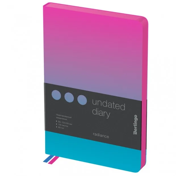 Стильный недатированный ежедневник Berlingo Radiance формата B6 с ярким цветным контрастным срезом и ультрамягкой обложкой из высококачественной экокожи. Насыщенный розово-голубой градиент стильно сочетается со срезом розового цвета. Внутренний блок состоит из 136 листов высококачественной кремовой бумаги повышенной плотности 80 г/м² с пантонной печатью в 2 краски. Недатированный ежедневник Berlingo Radiance представлен в размере 122 на 183 мм. Перфорированные уголки, справочная информация и 2 закладки-ляссе сделают использование ежедневника Berlingo Radiance комфортным. Внутри располагаются отрывные заметки и бланки извещения о ДТП, справочные материалы. Недатированный прошитый ежедневник Berlingo подходит под персонализацию. 3 комплекта стикеров станут приятным подарком. • Формат: B6; • Размер: 122*183 мм; • Количество листов: 136; • Материал обложки: экокожа; • Цвет обложки: розовый/голубой.