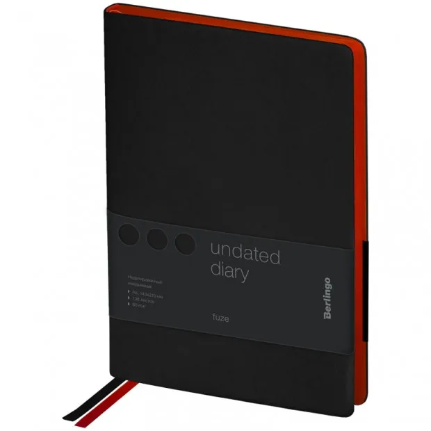 Стильный недатированный ежедневник Berlingo Fuze формата А5 с ультрамягкой обложкой из экокожи. Обложка черного цвета ярко контрастирует с красным срезом. Внутренний блок состоит из 136 листов высококачественной кремовой бумаги повышенной плотности 80 г/м² с пантонной печатью в 2 краски. Недатированный ежедневник Berlingo Fuze представлен в размере 143 на 210 мм. Перфорированные уголки и 2 закладки-ляссе сделают использование ежедневника Berlingo Fuze комфортным. Внутри располагаются отрывные заметки, бланки извещения о ДТП и справочные материалы. Недатированный ежедневник Berlingo подходит под персонализацию. 3 комплекта стикеров станут приятным подарком. • Формат: A5; • Размер: 143*210 мм; • Количество листов: 136; • Материал обложки: экокожа; • Цвет обложки: черный.