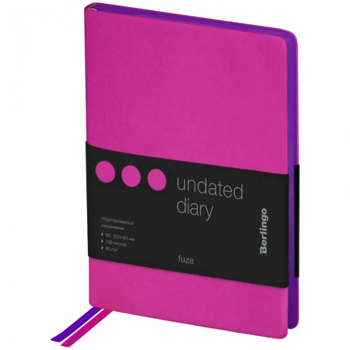 Стильный недатированный ежедневник Berlingo Fuze формата B6 с ультрамягкой обложкой из экокожи. Обложка цвета фуксии ярко контрастирует с фиолетовым срезом. Внутренний блок состоит из 136 листов высококачественной кремовой бумаги повышенной плотности 80 г/м² с пантонной печатью в 2 краски. Недатированный ежедневник Berlingo Fuze представлен в размере 122 на 183 мм. Перфорированные уголки и 2 закладки-ляссе сделают использование ежедневника Berlingo Fuze комфортным. Внутри располагаются отрывные заметки, бланки извещения о ДТП и справочные материалы. Недатированный ежедневник Berlingo подходит под персонализацию. 3 комплекта стикеров станут приятным подарком. • Формат: B6; • Размер: 122*183 мм; • Количество листов: 136; • Материал обложки: экокожа; • Цвет обложки: фуксия.