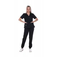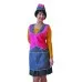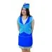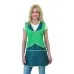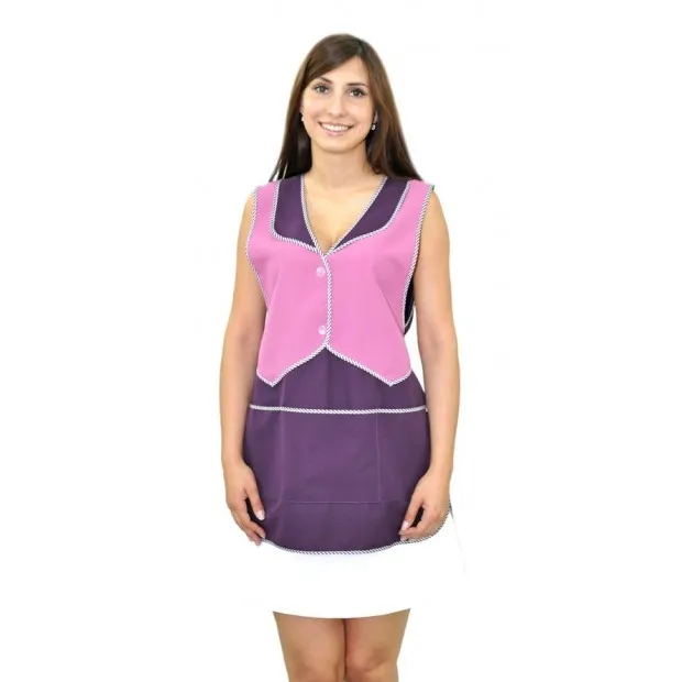 Фартук средней длины, перекидной, имеющий спинку без отделки и полочку, верхняя отрезная часть которой выполнена из ткани контрастного цвета в виде жилета, с имитацией застежки на две пуговицы и накладным воротником. В нижней части полочки расположен вместительный карман из трех частей. Объем фартука регулируется завязками-поясами, все срезы фартука обработаны кантом из капроновой ткани. Фартук предназначен для защиты от общепроизводственных загрязнений.