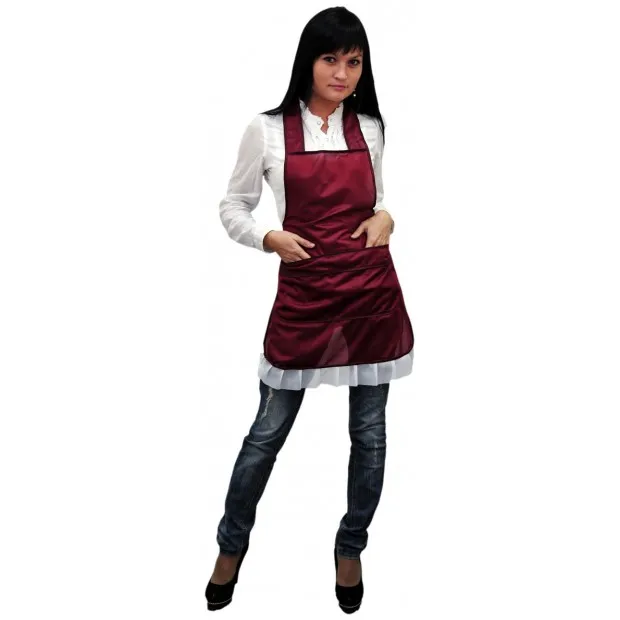 Фартук с грудкой, с одним накладным карманом, рассроченным на части, на уровни талии завязки. Рекомендуется для работников торговли, сферы обслуживания, технического персонала гостиниц.