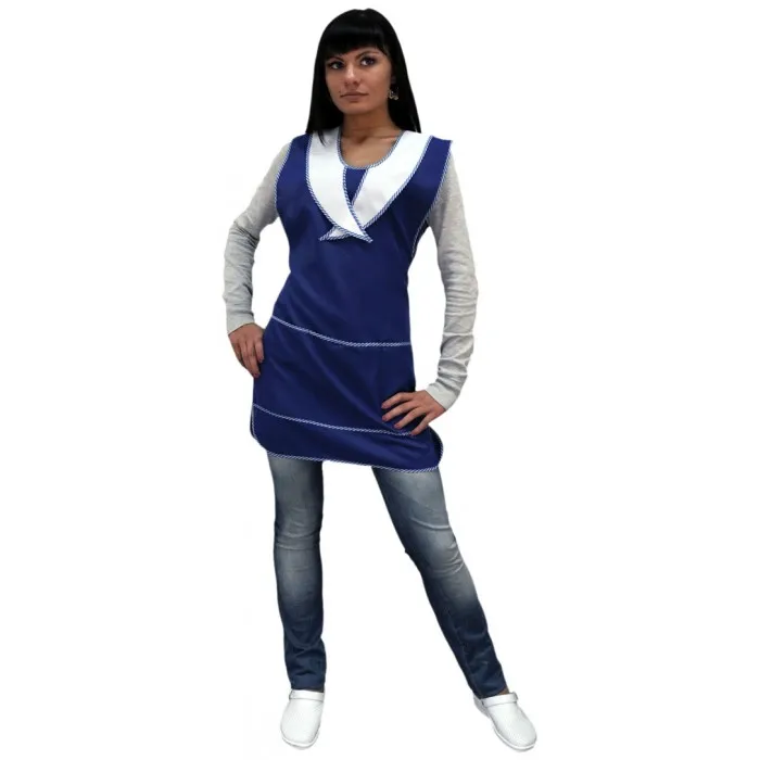 Фартук с декоративным воротником из белой ткани, с одним накладным карманом, расстроченным на части. Окантовка из ткани в контрастную полоску. По талии объем регулируется при помощи полупоясов. Рекомендуется для работниц сферы обслуживания, технического персонала гостиниц, для работников торговли.