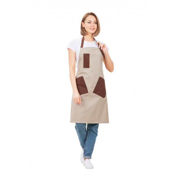 Хороший фартук не только защищает при работе на кухне, но и поднимает престиж любого заведения так или иначе связанного со сферой общественного питания. Фартук имеет приятный и стильный оттенок мокко с двумя контрастными темными карманами, каждый из которых усилен хольнитенами - заклепками, обеспечивающими неразъемное соединение деталей. Карманы в данном изделии являются акцентными. Два наклонных накладных кармана внизу для различных предметов, которые всегда должны быть под рукой и один небольшой карман на нагруднике для мелочей. Два полупояса и лямка с возможностью регулировки по высоте позволяют фартуку прекрасно сидеть по фигуре.
