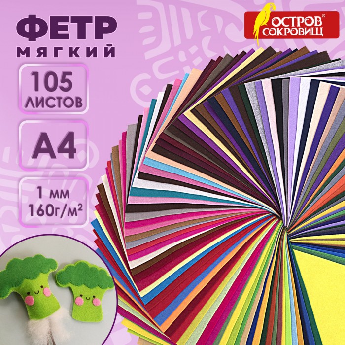 Фетр мягкий А4, 1 мм, 105 листов, 105 цветов, плотность 160 г/м2, МЯГКИЙ, ОСТРОВ СОКРОВИЩ, 665474