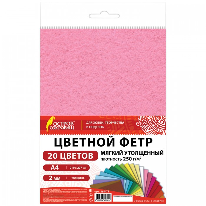 Фетр утолщенный А4, 2 мм, 20 листов, 20 цветов, плотность 250 г/м2, ОСТРОВ СОКРОВИЩ, 665475