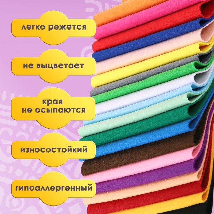 Цветной фетр ОСТРОВ СОКРОВИЩ предназначен для создания ярких творческих поделок дома, в школе или в детском саду. Используется для создания аппликаций и вышивки, легко режется и приклеивается на ровную поверхность.