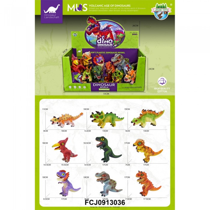 Размер упаковки: 55*30*24 см Функционал: фигурки динозавров Упаковка: картонный шоубокс Страна обладатель бренда: КНР Материал: пластик Комплектация: игрушка - 1 шт. Возраст ребенка: от 3 лет Яркая фигурка динозавра представляет очень хорошо детализированный и проработанный образ. Такие игрушки отлично подходят в качестве демонстрационного материала, чтобы показать ребенку наглядно, как выглядели доисторические ящеры. Так же с ними можно устроить сюжетные игры, фигурки можно сортировать и классифицировать по разным принципам (водоплавающие, наземные, летающие; хищники и травоядные). Такие игры расширяют словарных запас и кругозор детей, дают сведения об окружающем мире. Все фигурки изготовлены из прочных и безопасных материалов.