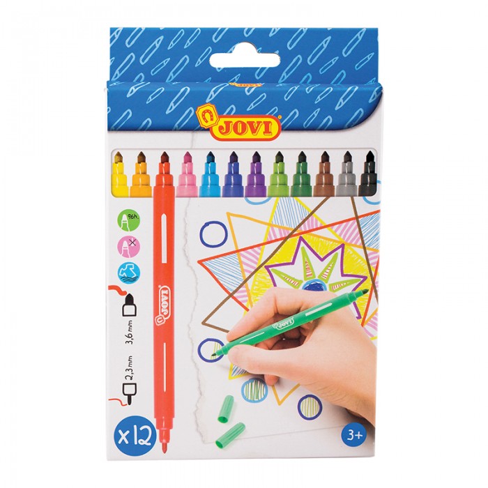 Двусторонние фломастеры JOVI с двумя пишущими узлами - 2,3 и 3,6 мм и вентилируемым колпачком. В наборе 12 цветов с особо прочным наконечником: жёлтый, красный, оранжевый, чёрный, коричневый, голубой, синий, розовый, фиолетовый, серый, зелёный, темно-зелёный. Фломастеры представлены с коническим наконечником. Полностью безопасные гипоаллергенные чернила на водной основе с пищевыми красителями. Специальные вентилируемые колпачки обеспечивают прохождение воздуха при случайном проглатывании. Фломастеры JOVI легко смываются с кожи и отстирываются с большинства видов тканей. Упакованы в картонную коробку с европодвесом. • Количество цветов: 12; • Тип наконечника: конический;