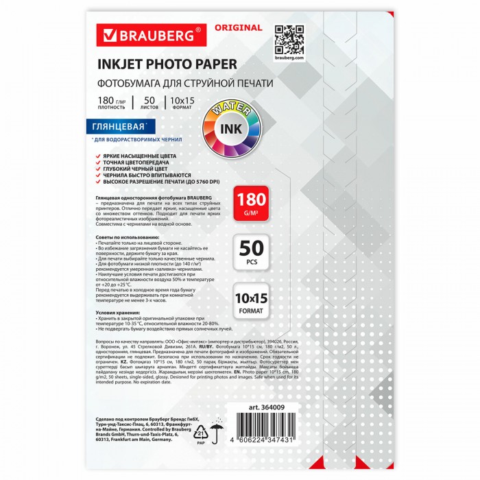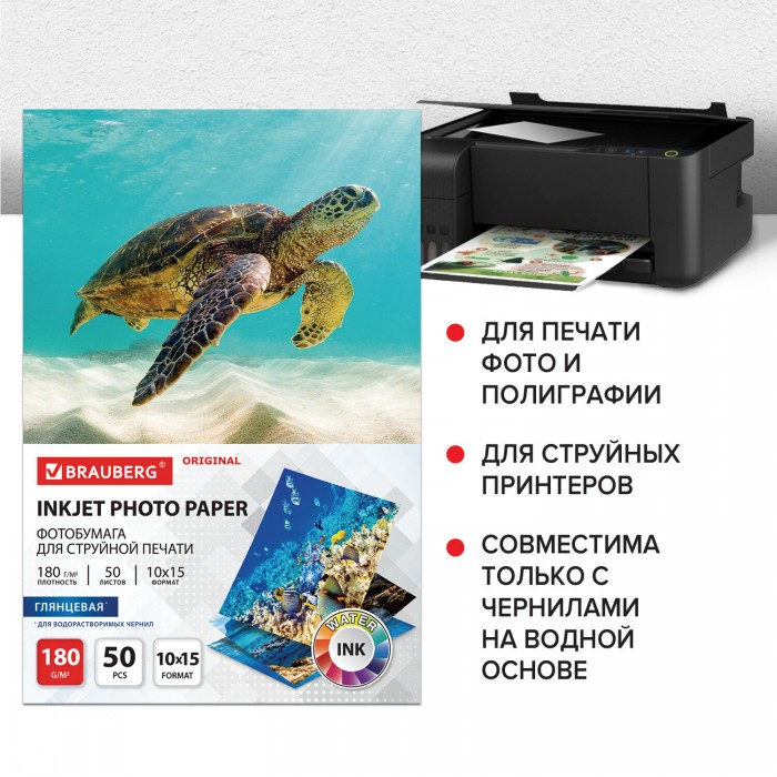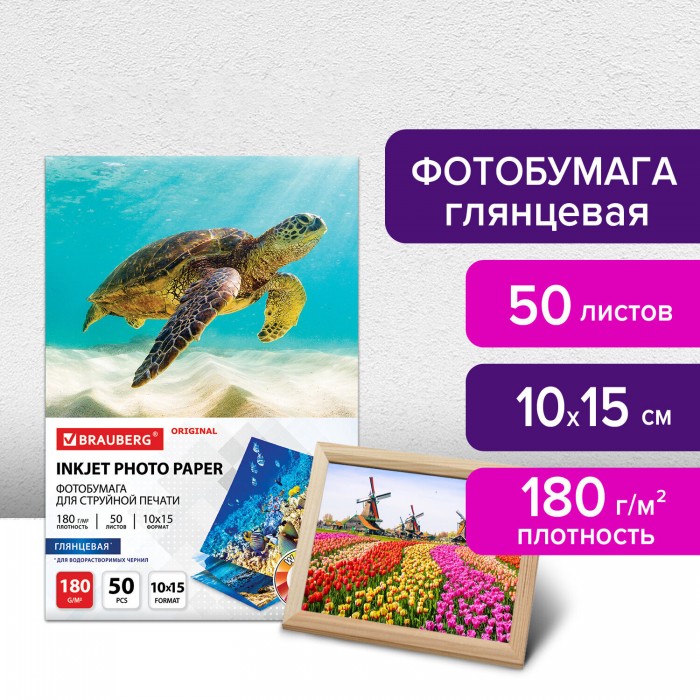 Фотобумага глянцевая, 10х15 см, 180 г/м2, односторонняя, 50 листов, BRAUBERG ORIGINAL, 364009