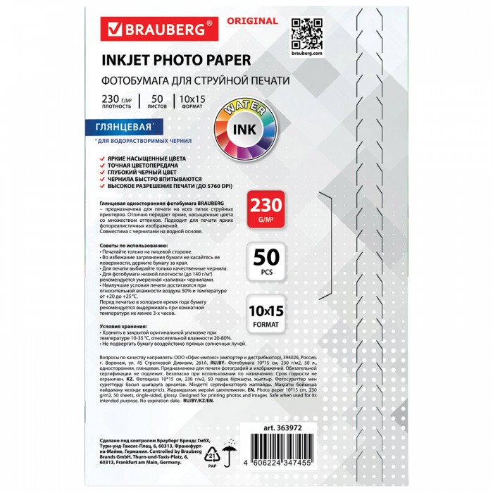 Фотобумага глянцевая, 10х15 см, 230 г/м2, односторонняя, 50 листов, BRAUBERG ORIGINAL, 363972