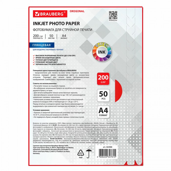 Фотобумага глянцевая, А4, 200 г/м2, односторонняя, 50 листов, BRAUBERG ORIGINAL, 363988