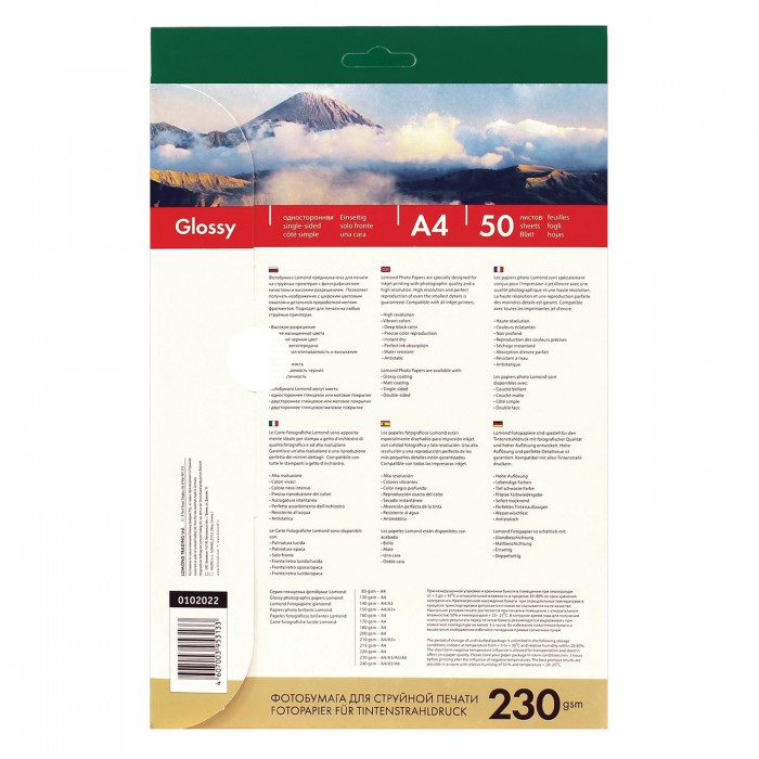Фотобумага глянцевая, А4, 230 г/м2, односторонняя, 50 листов, LOMOND, 0102022