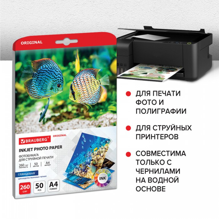 Фотобумага глянцевая, А4, 260 г/м2, односторонняя, 50 листов, BRAUBERG ORIGINAL, 363992